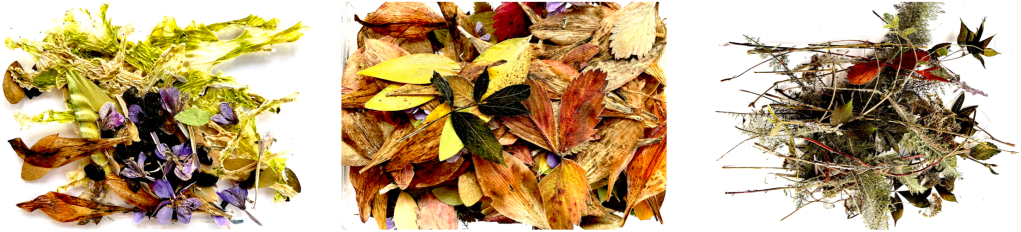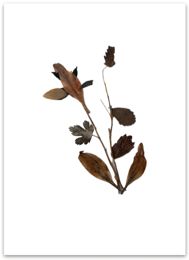 7. Démonstration — Choisir des végétaux séchés parmi ceux récoltés et composer un motif sur fond blanc : placer, déplacer et superposer les éléments pour obtenir un motif floral satisfaisant. À noter : les couleurs des éléments choisis n’ont aucune importance. Photographier la composition.