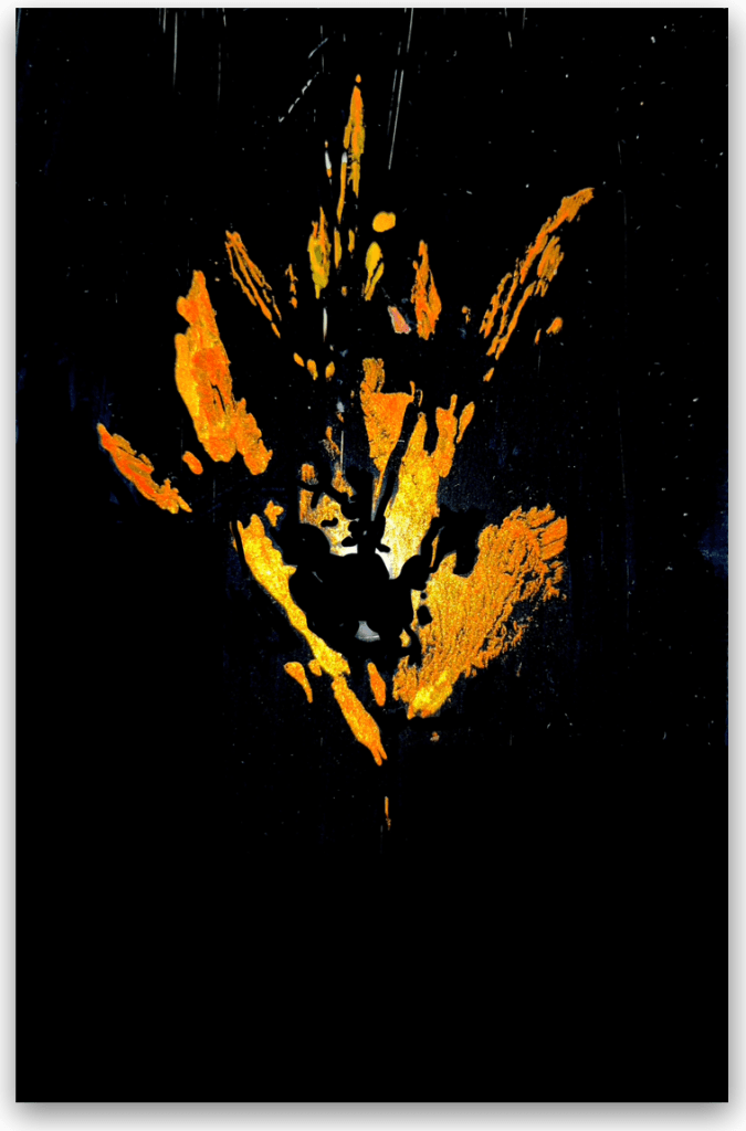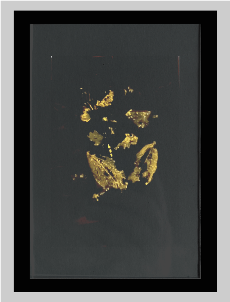 17. Lorsque la couleur est sèche, appliquer de la gouache noire sur la surface imprimée à l’aide d’un gros pinceau. Laisser sécher. Replacer la composition à l’endroit. Insérer le carton noir dans son cahier de traces.